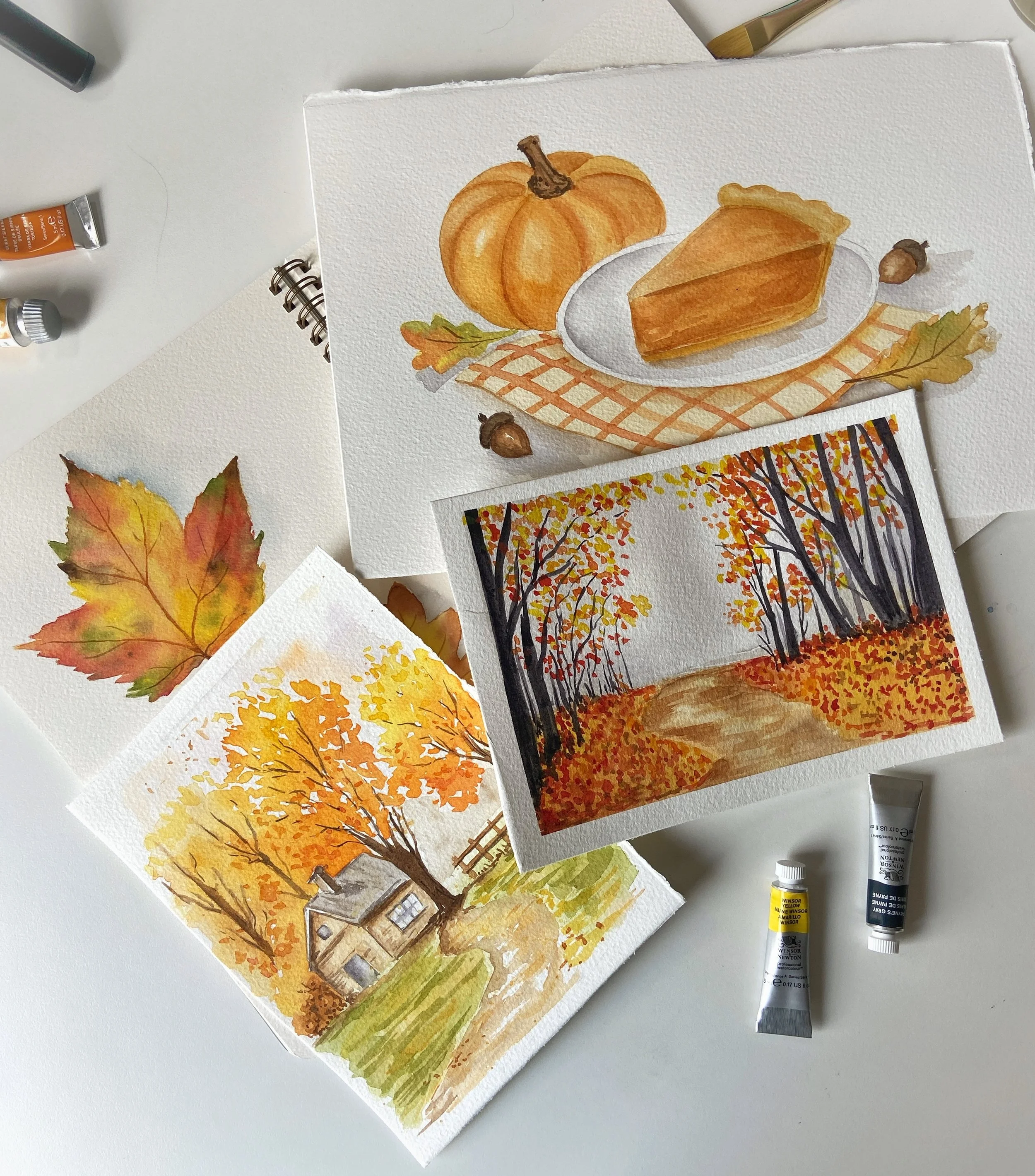 Online beginner watercolor workshop. Learn basics, techniques to create an autumn landscape in easy steps.