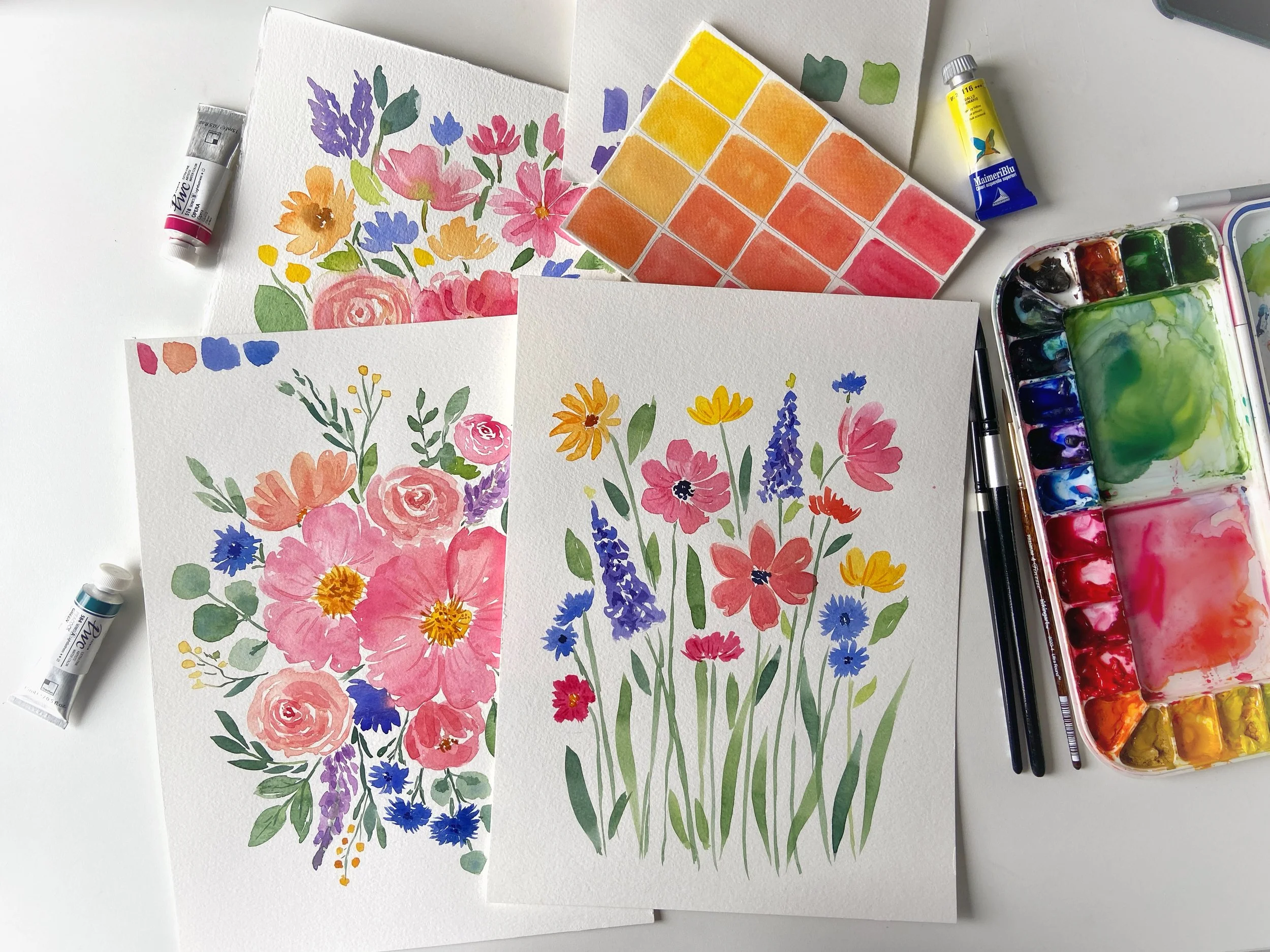 Online beginner watercolor workshop. Learn to paint loose and expressive florals with watercolors using fun techniques.